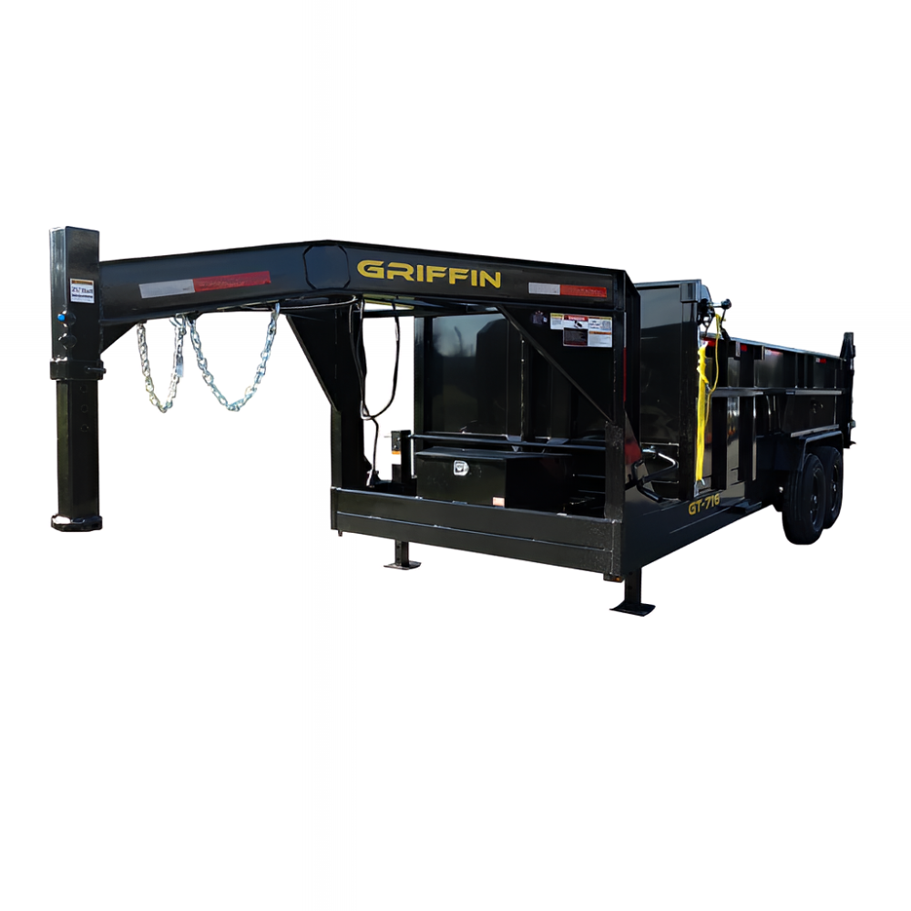 The 7-foot by 16-foot goose neck telescopic dump trailer is designed for robust performance with its 3-foot high sides and dual greaseable 7,000lb axles, ensuring reliable load support and durability. Its advanced single telescopic hydraulic cylinder delivers exceptional dumping leverage, making the toughest tasks simple and efficient. This combination of powerful features provides unmatched strength and versatility, making it an ideal choice for heavy-duty hauling and construction projects.