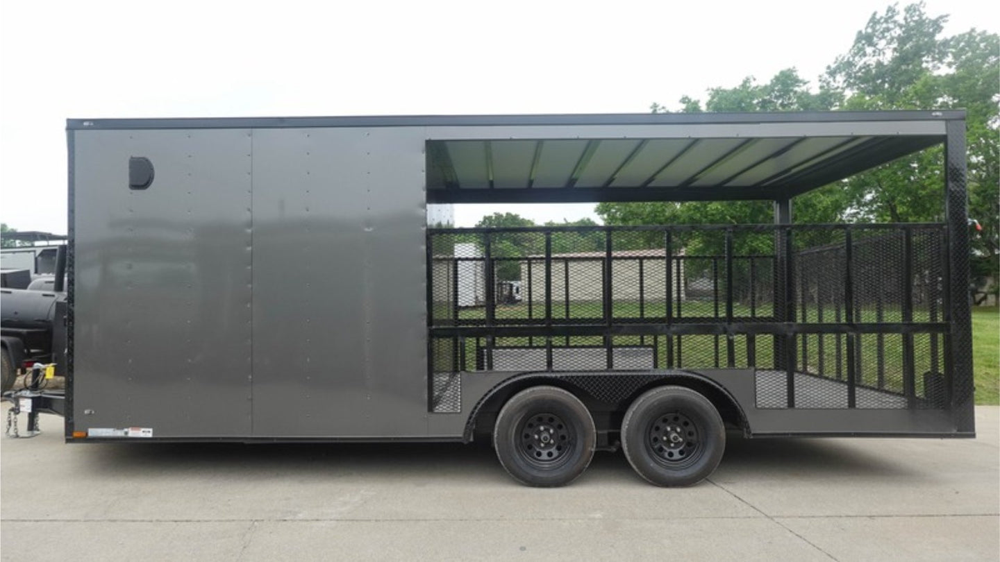 This 8.5×20 Hybrid Enclosed Trailer blends function and durability with a sharp charcoal finish and blackout (BO) trim. Designed with an enclosed front workspace and a roofed utility deck, it’s ideal for mobile workstations, transport, or event use.