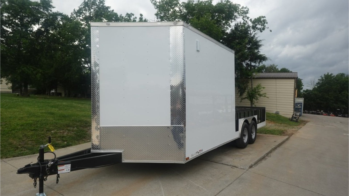 This 8.5×20 Enclosed Hybrid Trailer is ideal for hauling motorcycles, ATVs, tools, and event gear. With a no-roof rear deck and smart access features, it offers ease of use, spacious storage, and heavy-duty durability.