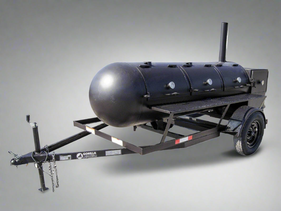 The 330-Gallon Pull Behind BBQ Smoker is built for pitmasters, caterers, and BBQ competitors who need serious cooking capacity, rugged construction, and dependable performance. With a massive quarter-inch thick barrel, slide-out cooking trays, and a durable firebox, this smoker delivers precision, versatility, and long-term durability.